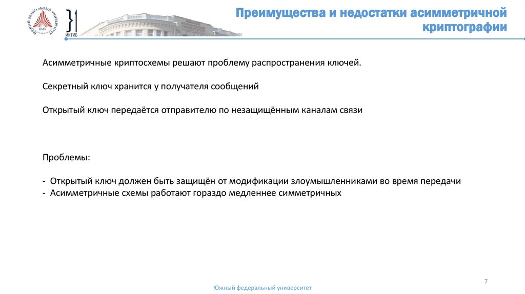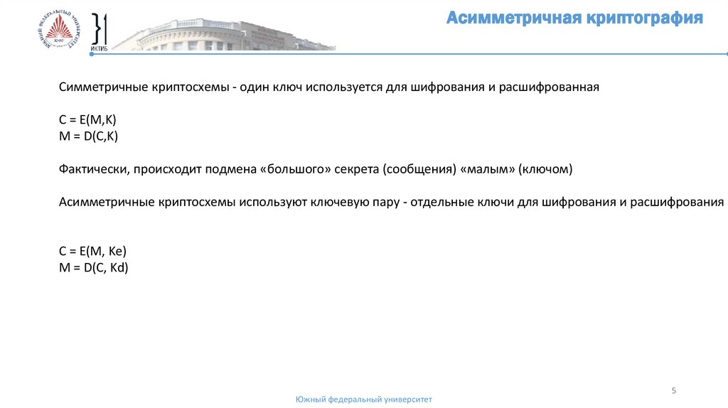 Асимметричная криптографияСимметричные криптосхемы - один ключ используется для шифрования и расшифрованная