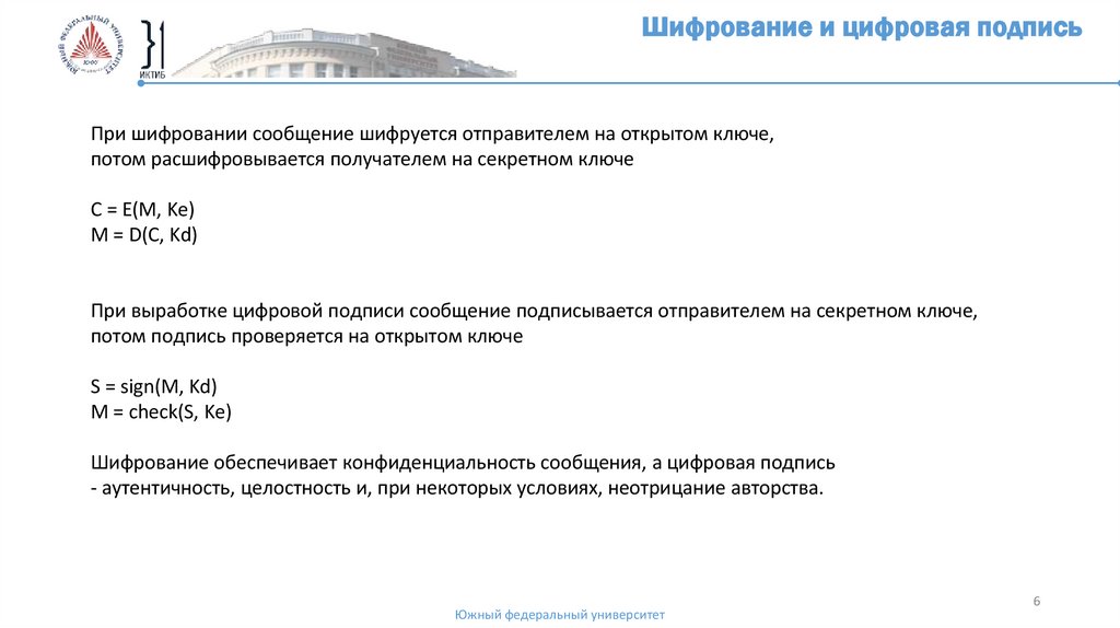 Шифрование обеспечивает конфиденциальность сообщения, а цифровая подпись