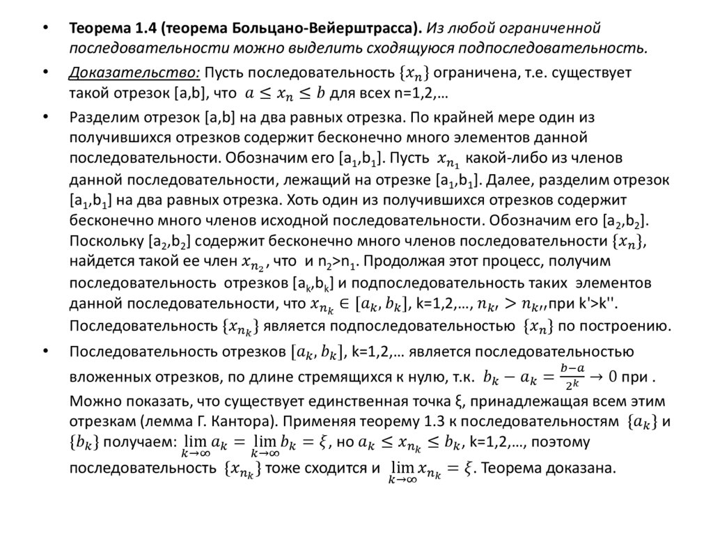 Теорема 1.4 (теорема Больцано-Вейерштрасса). Из любой ограниченной