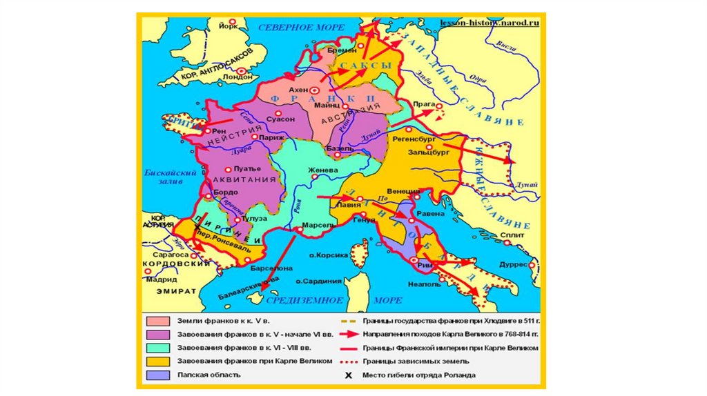 • 1. Карл Великий из династии Каролингов (768-814)• а) разбил лангобардов, аваров, подчинил саксов (8 походов,30 лет)