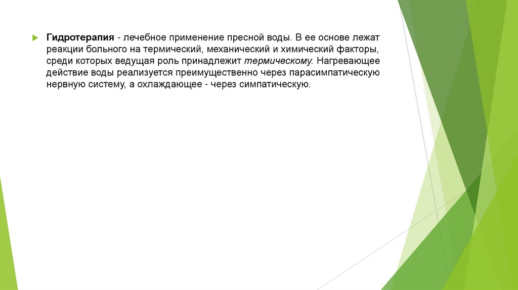 Гидротерапия - лечебное применение пресной воды. В ее основе лежатреакции больного на термический, механический и химический факторы,