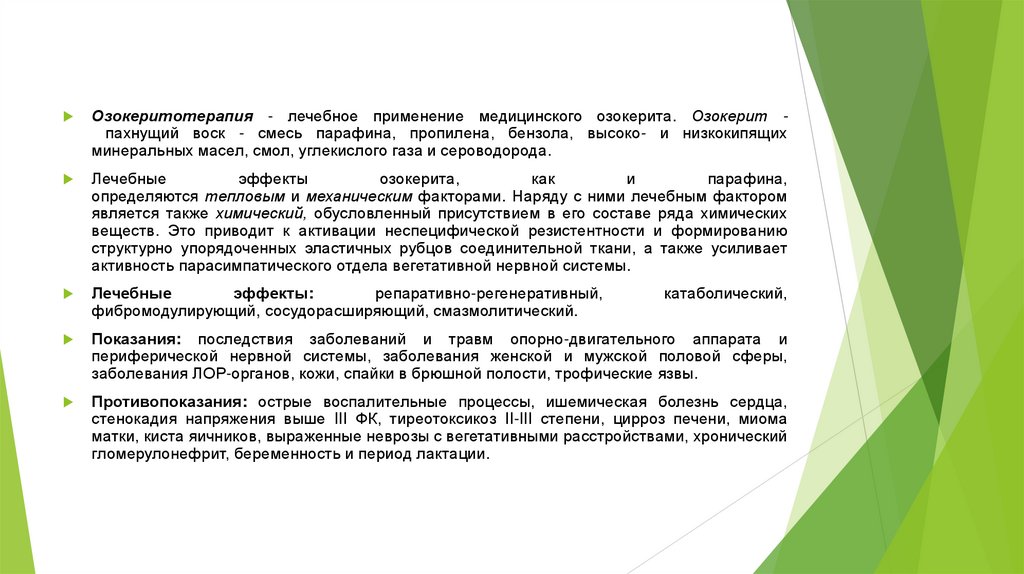 Озокеритотерапия - лечебное применение медицинского озокерита. Озокерит пахнущий воск - смесь парафина, пропилена, бензола, высоко- и низкокипящихминеральных масел, смол, углекислого газа и сероводорода.