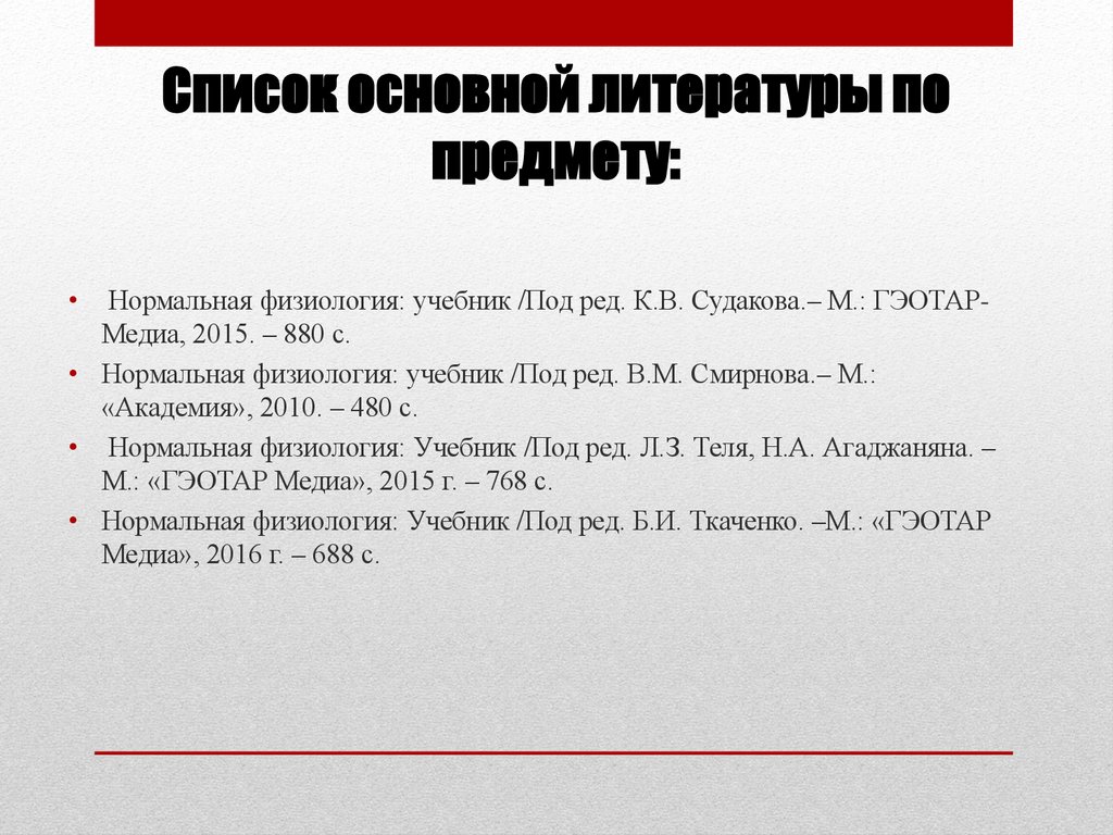 • Нормальная физиология: Учебник /Под ред. Б.И. Ткаченко. –М.: «ГЭОТАР