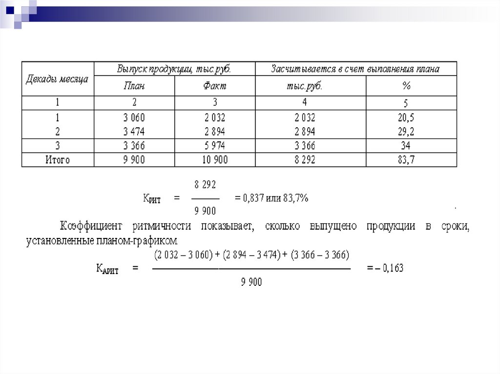 Коэффициент ритмичности показывает удельный вес продукции, сданной без нарушения графика.