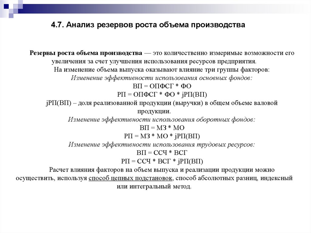 4.7. Анализ резервов роста объема производстваРезервы роста объема производства — это количественно измеримые возможности его