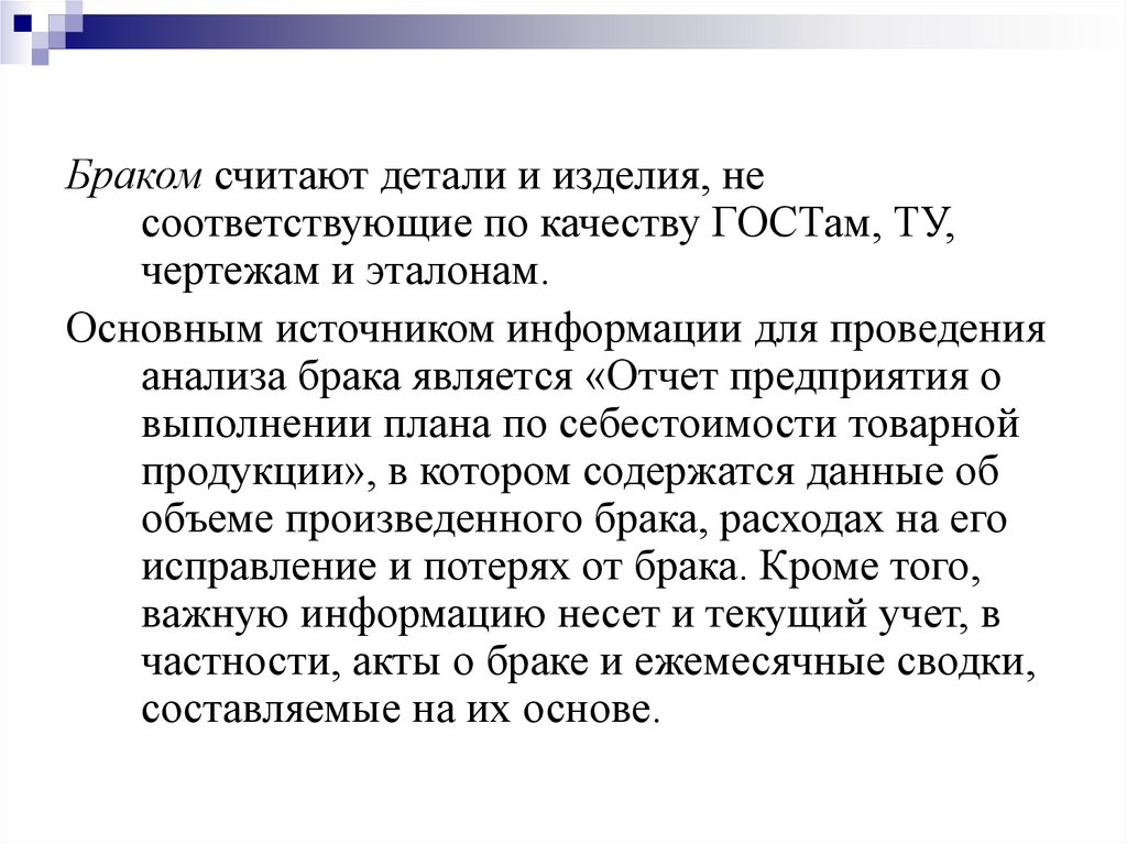 Браком считают детали и изделия, несоответствующие по качеству ГОСТам, ТУ,