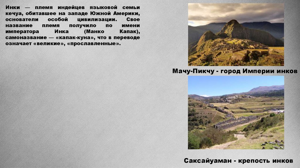 Инки — племя индейцев языковой семьикечуа, обитавшее на западе Южной Америки,