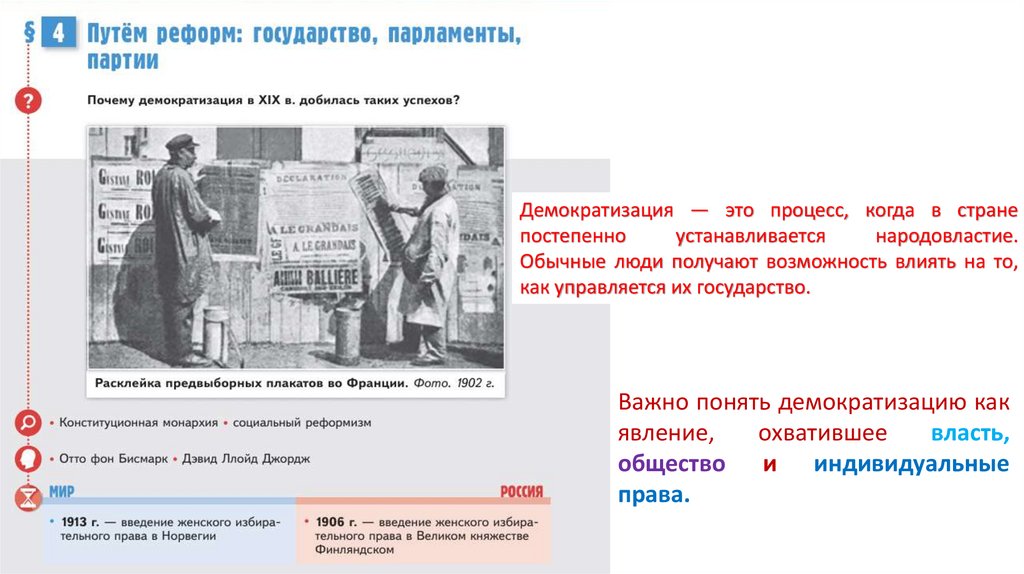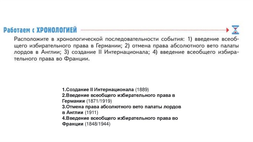 1.Создание II Интернационала (1889)2.Введение всеобщего избирательного права в