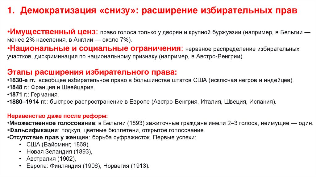 1. Демократизация «снизу»: расширение избирательных прав•Имущественный ценз: право голоса только у дворян и крупной буржуазии (например, в Бельгии —