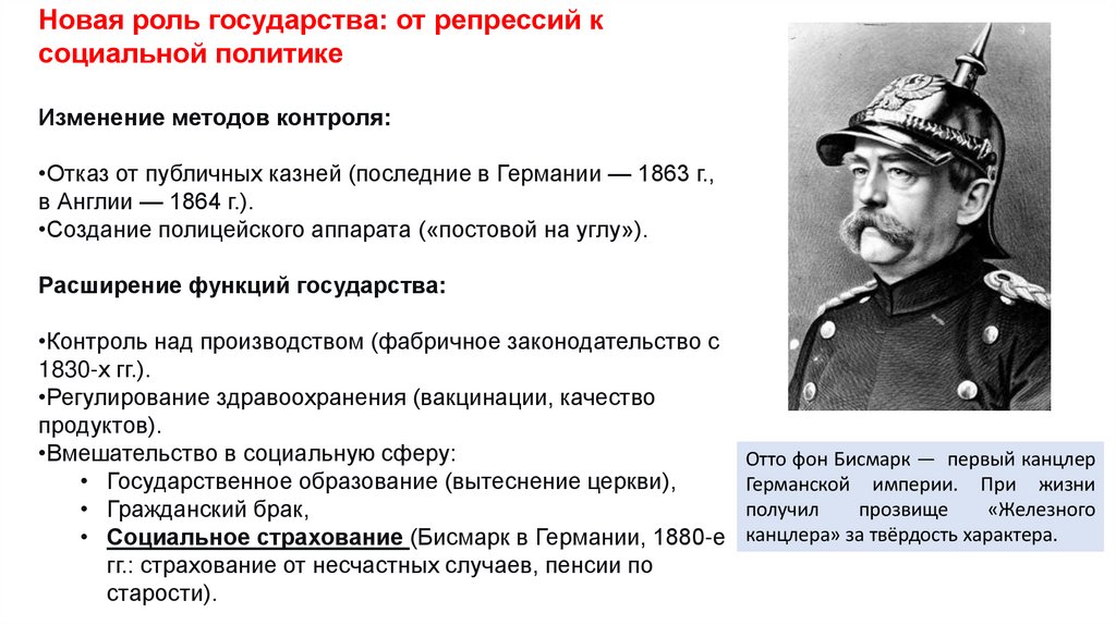 • Социальное страхование (Бисмарк в Германии, 1880-е