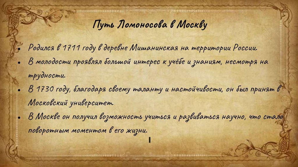 Путь Ломоносова в МосквуРодился в 1711 году в деревне Мишанинская на территории России.