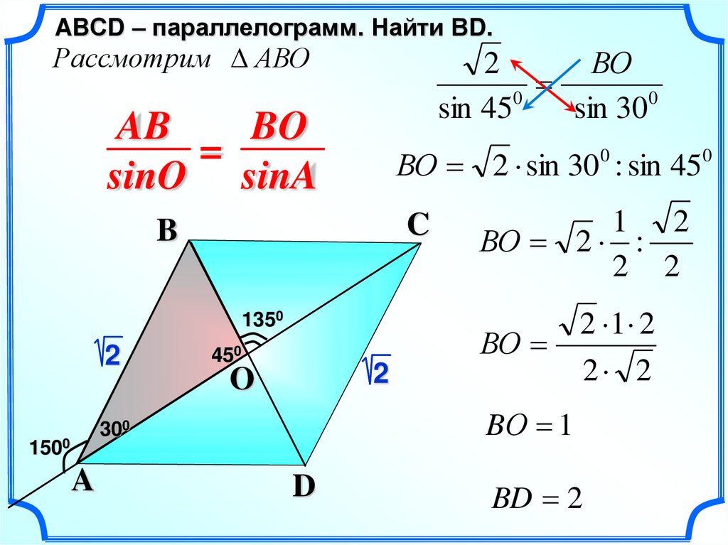 ABСD – параллелограмм. Найти ВD.Рассмотрим АВD