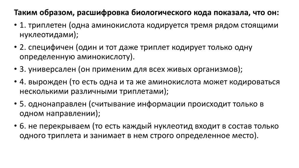 Таким образом, расшифровка биологического кода показала, что он:• 1. триплетен (одна аминокислота кодируется тремя рядом стоящими