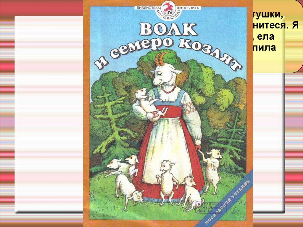 -Козлятушки, ребятушки,Отопритеся, отомкнитеся. Я