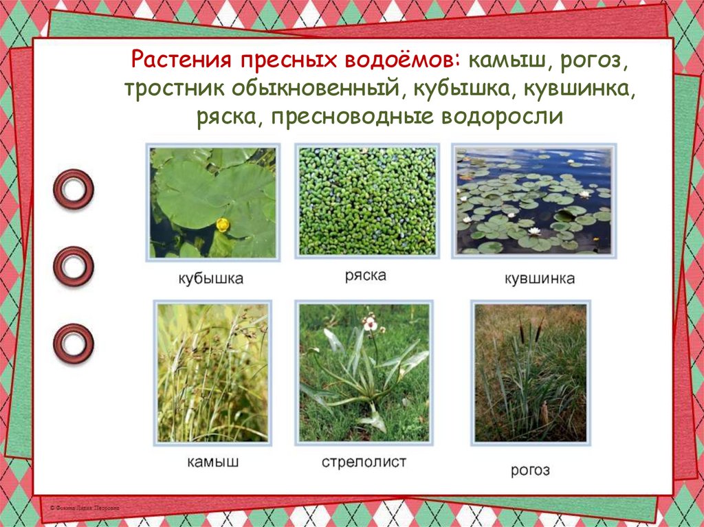 Растения пресных водоёмов: камыш, рогоз,тростник обыкновенный, кубышка, кувшинка,