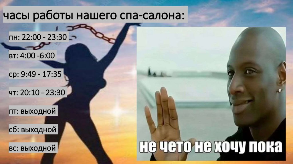 часы работы нашего спа-салона:пн: 22:00 - 23:30