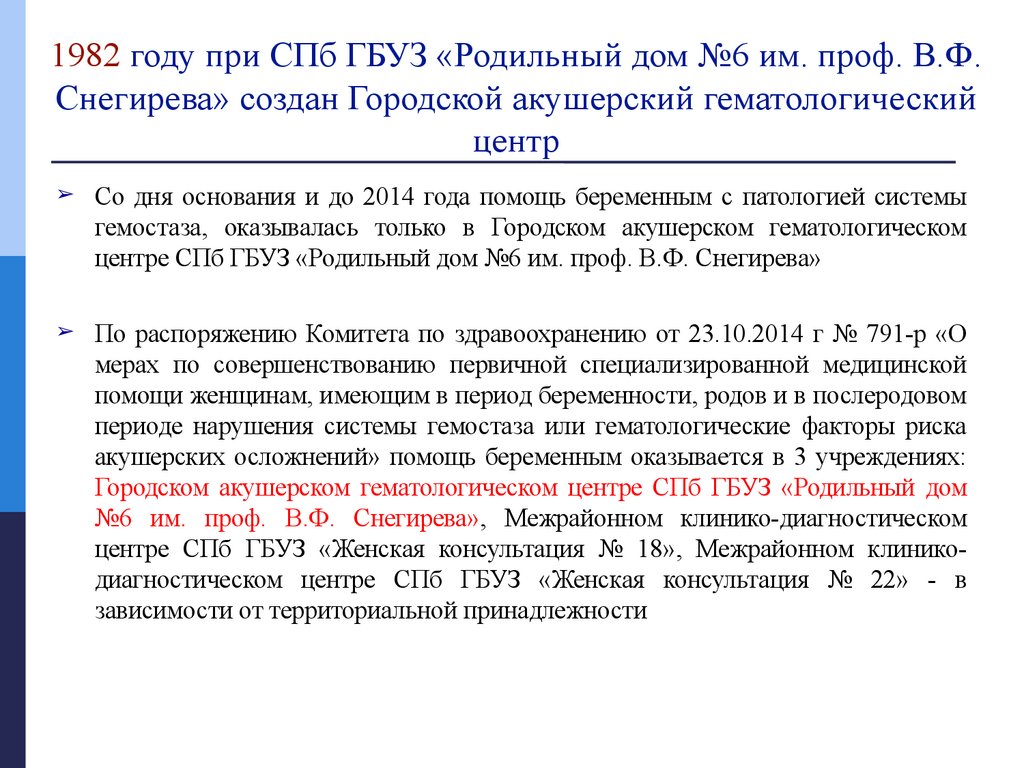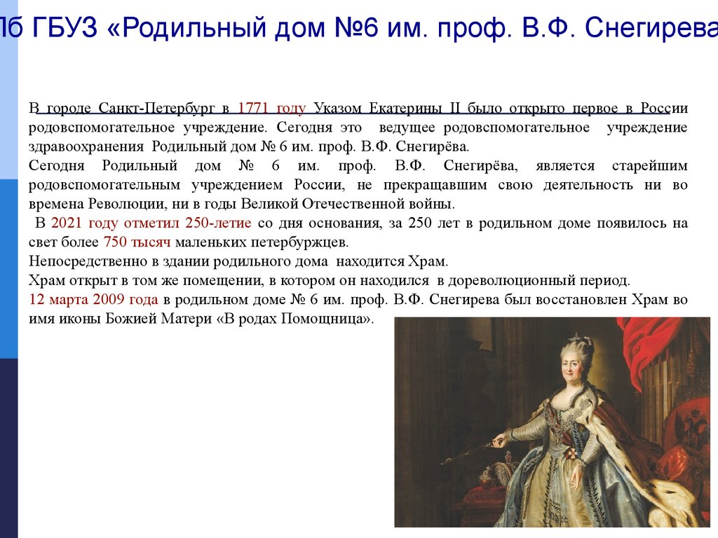 Пб ГБУЗ «Родильный дом №6 им. проф. В.Ф. СнегиреваВ городе Санкт-Петербург в 1771 году Указом Екатерины II было открыто первое в России