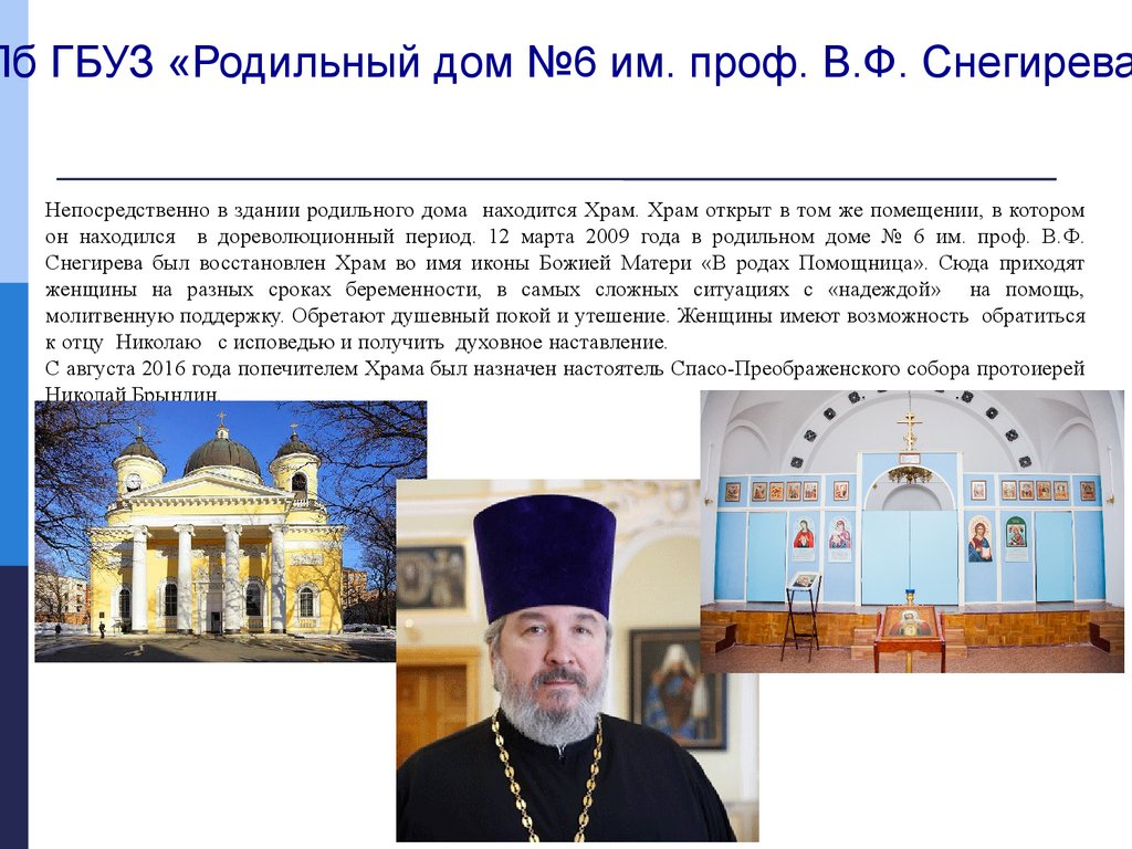 Пб ГБУЗ «Родильный дом №6 им. проф. В.Ф. СнегиреваНепосредственно в здании родильного дома находится Храм. Храм открыт в том же помещении, в котором