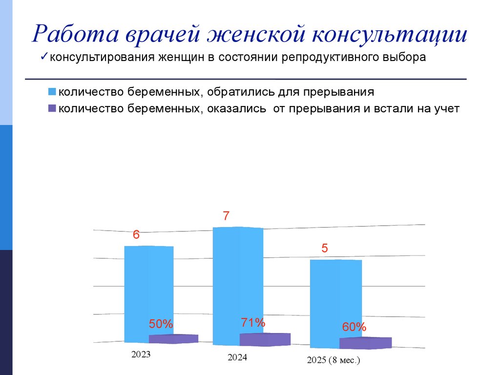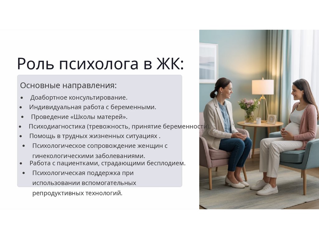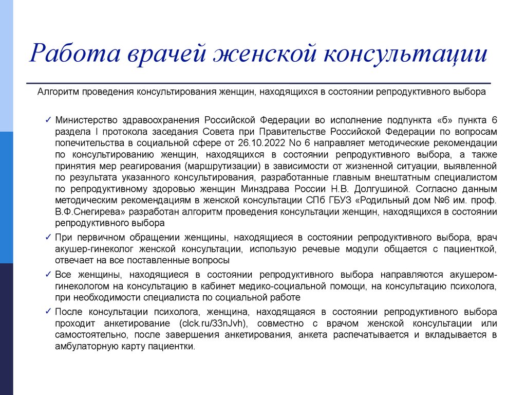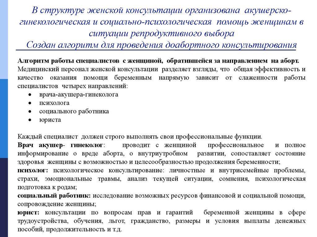 В структуре женской консультации организована акушерскогинекологическая и социально-психологическая помощь женщинам вситуации репродуктивного выбора
