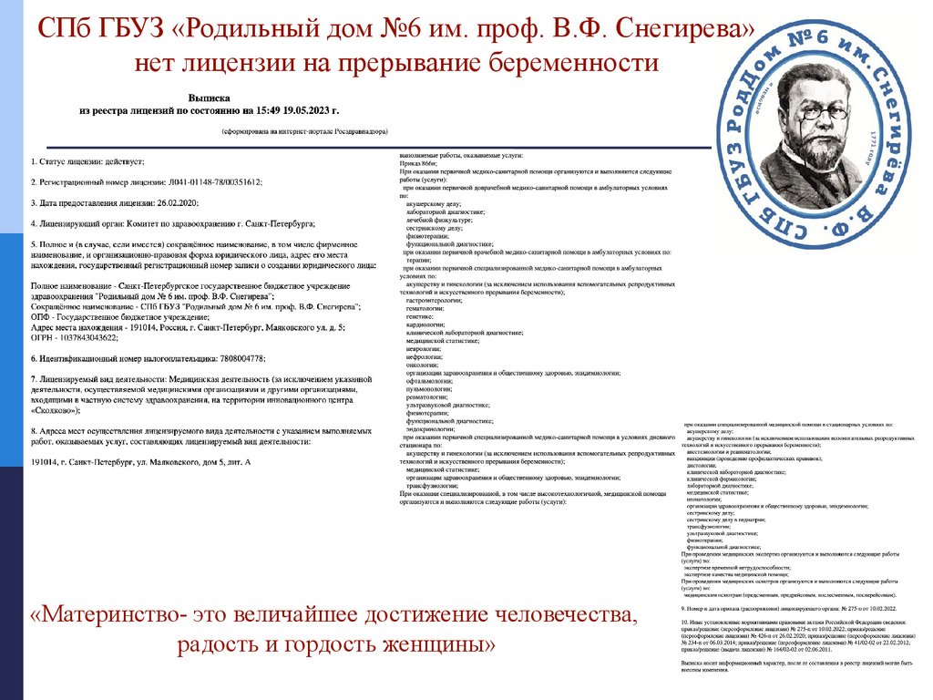 СПб ГБУЗ «Родильный дом №6 им. проф. В.Ф. Снегирева»нет лицензии на прерывание беременности