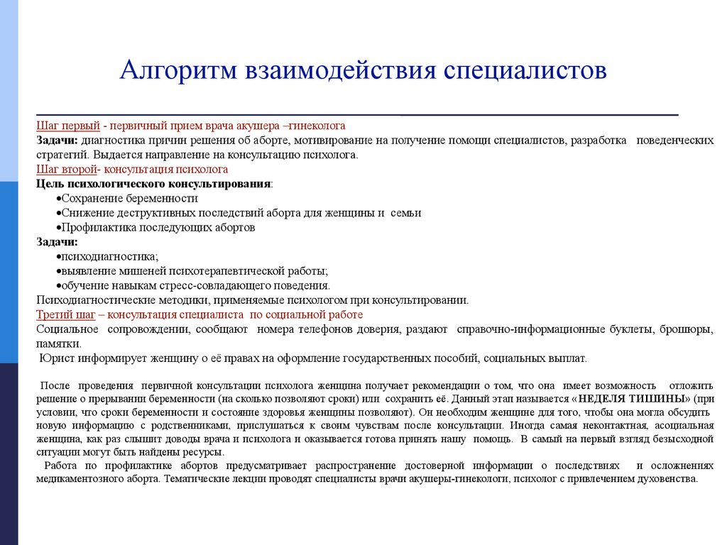Алгоритм работы специалистов с женщиной, обратившейся за направлением на аборт.
