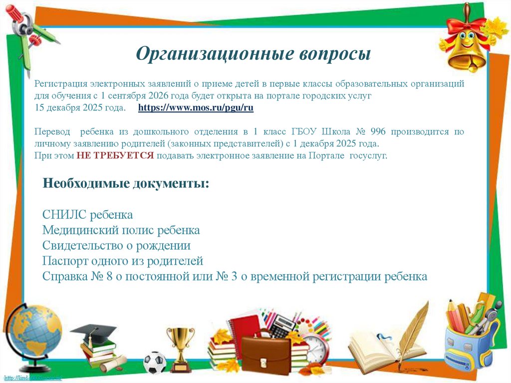 Перевод ребенка из дошкольного отделения в 1 класс ГБОУ Школа № 996 производится по