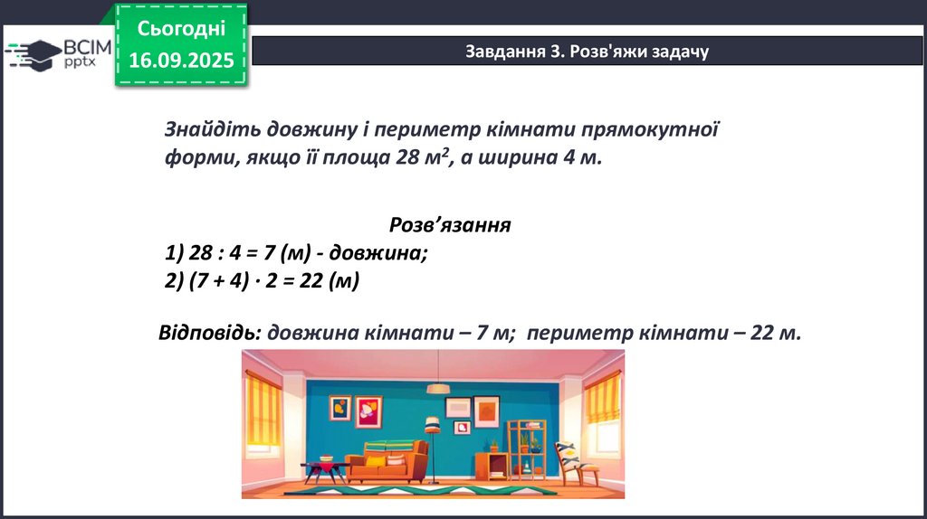 Відповідь: довжина кімнати – 7 м; периметр кімнати – 22 м.