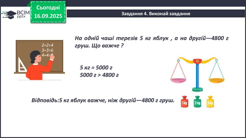 На одній чаші терезів 5 кг яблук , а на другій—4800 г