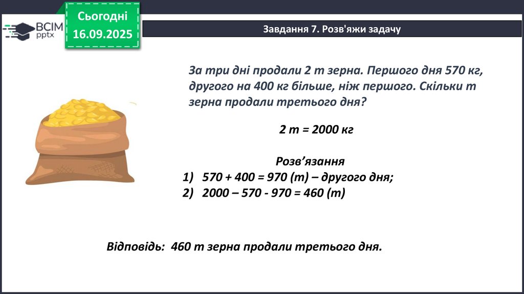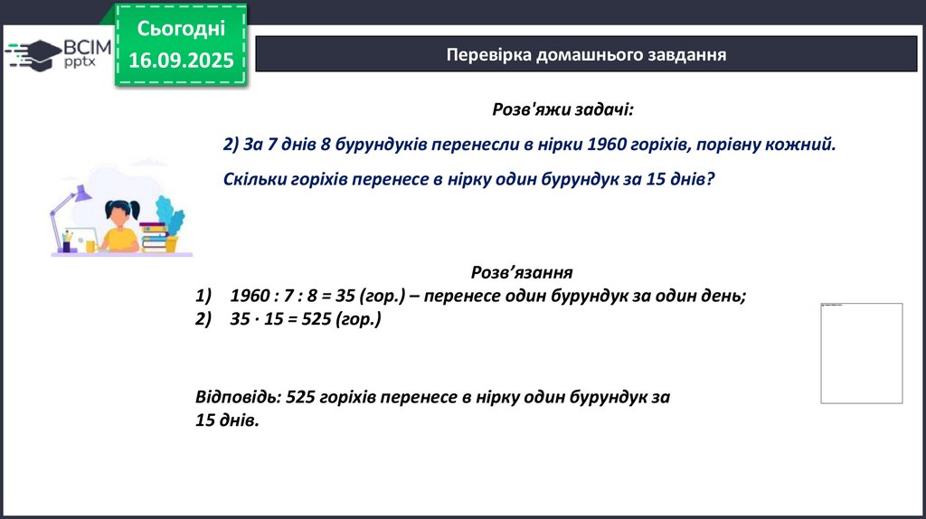 2) За 7 днів 8 бурундуків перенесли в нірки 1960 горіхів, порівну кожний.