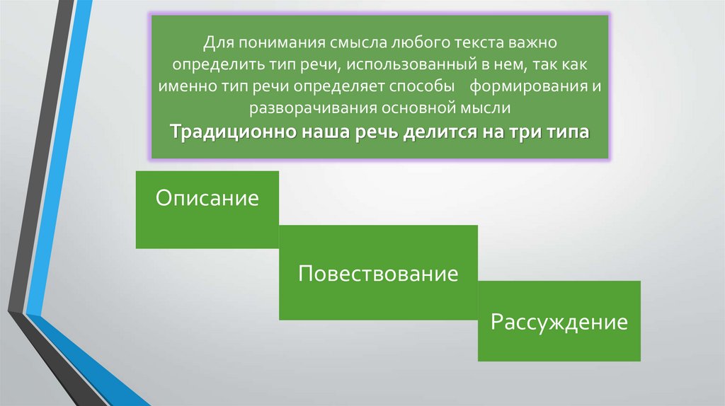 Для понимания смысла любого текста важноопределить тип речи, использованный в нем, так как