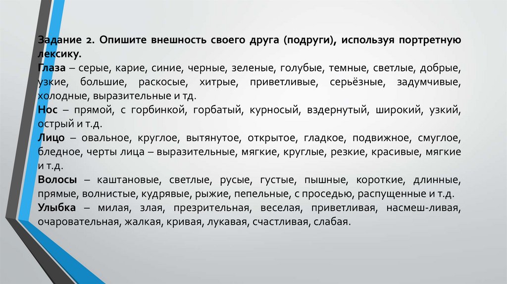 Задание 2. Опишите внешность своего друга (подруги), используя портретнуюлексику.