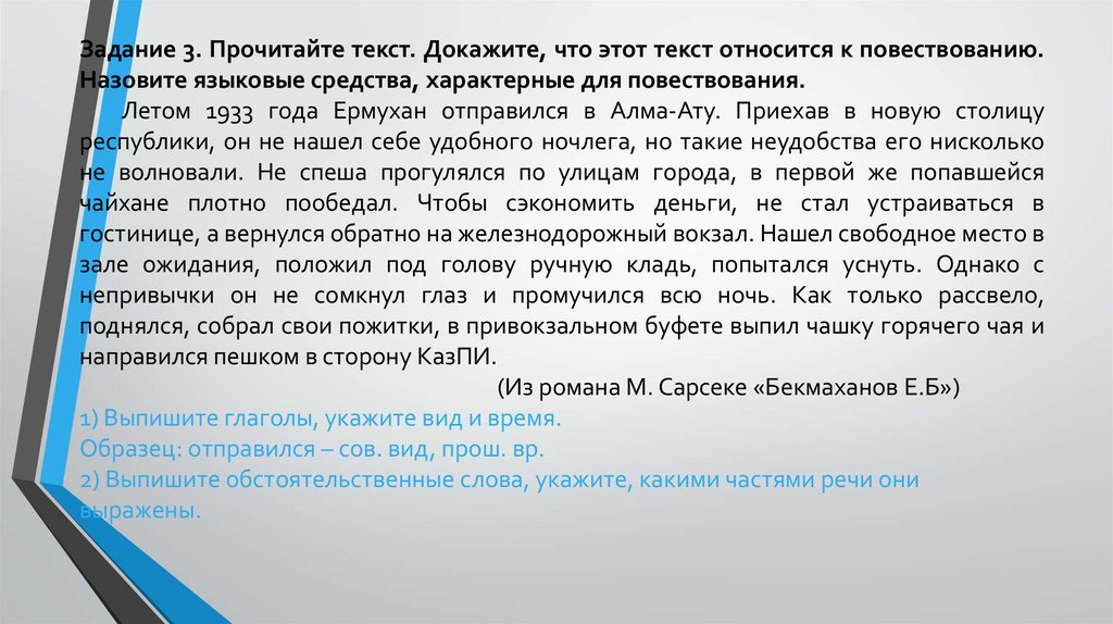 Задание 3. Прочитайте текст. Докажите, что этот текст относится к повествованию.Назовите языковые средства, характерные для повествования.