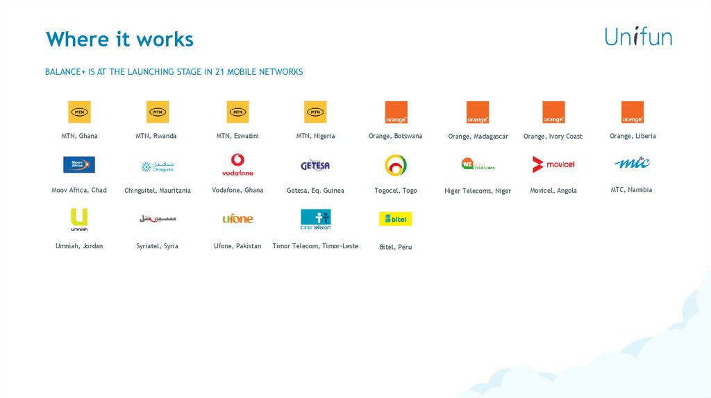 Where it worksBALANCE+ IS AT THE LAUNCHING STAGE IN 21 MOBILE NETWORKS