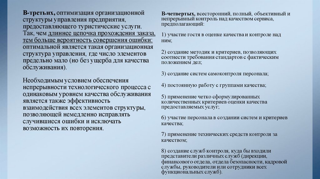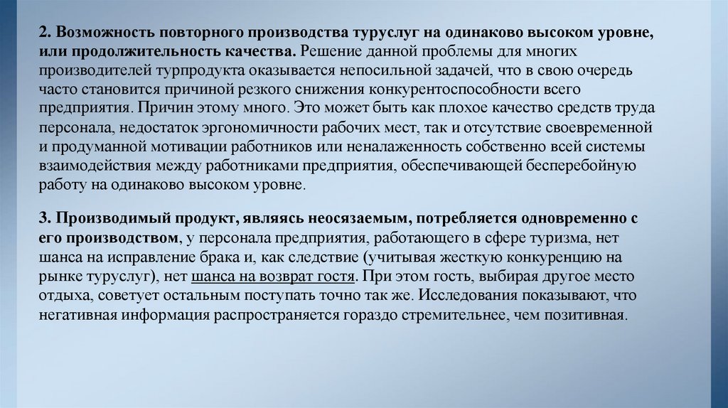 2. Возможность повторного производства туруслуг на одинаково высоком уровне,или продолжительность качества. Решение данной проблемы для многих