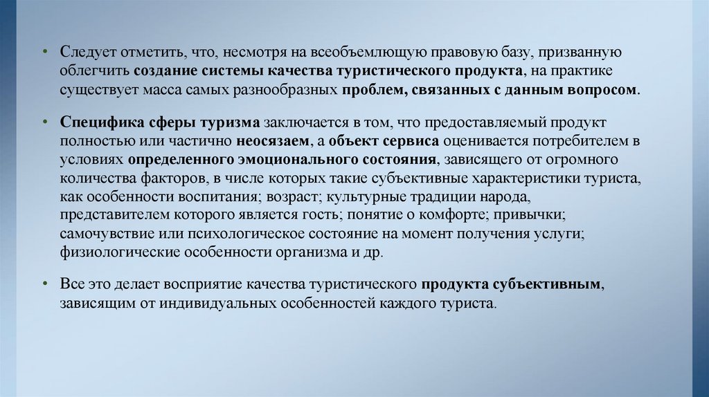 • Следует отметить, что, несмотря на всеобъемлющую правовую базу, призваннуюоблегчить создание системы качества туристического продукта, на практике