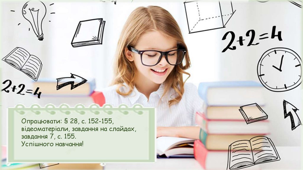 Опрацювати: § 28, с. 152-155,відеоматеріали, завдання на слайдах,