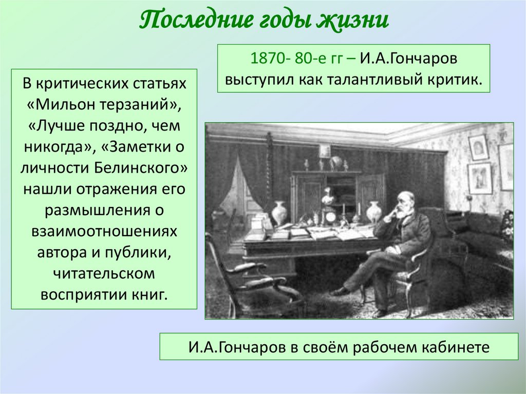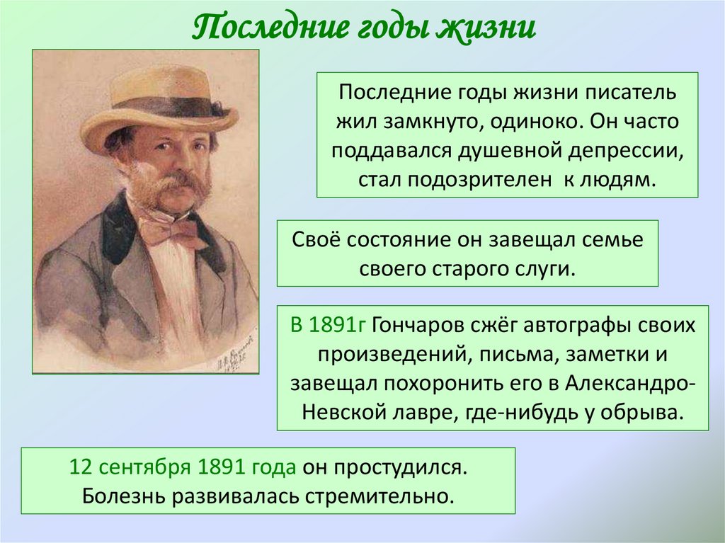 Последние годы жизни28 сентября 1891г – И.А.Гончаров умер от воспаления лёгких