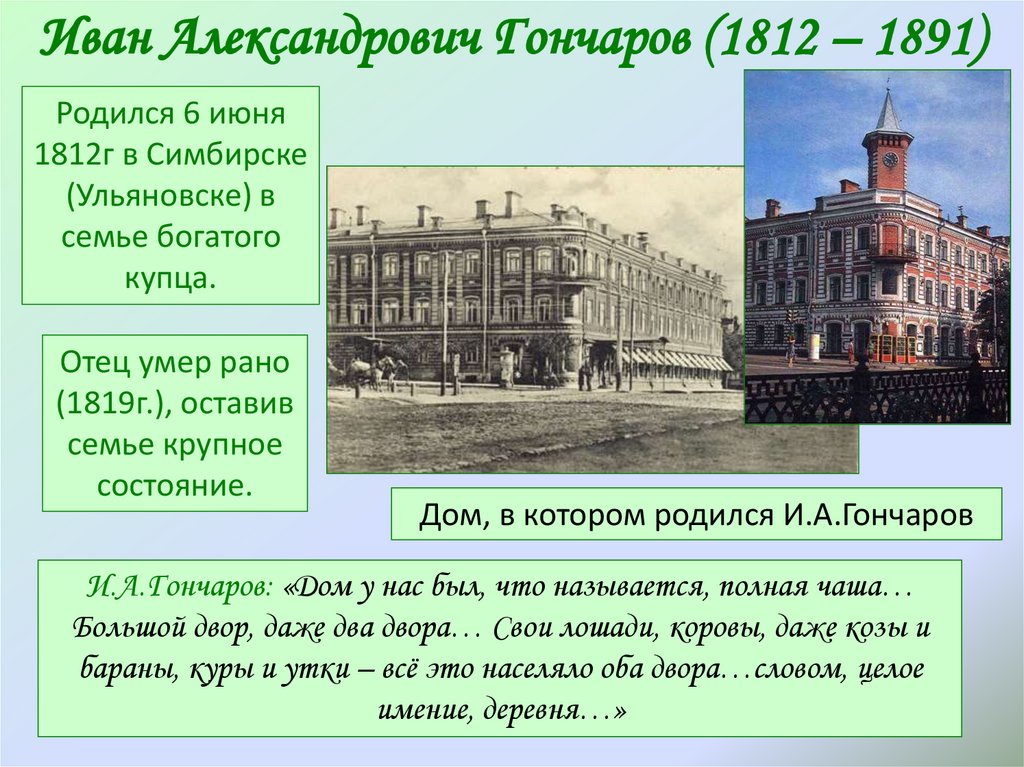 Иван Гончаров родился 6 (18) июня 1812 года в Симбирске.Его отец Александр Иванович (1754—-1819) и мать Авдотья