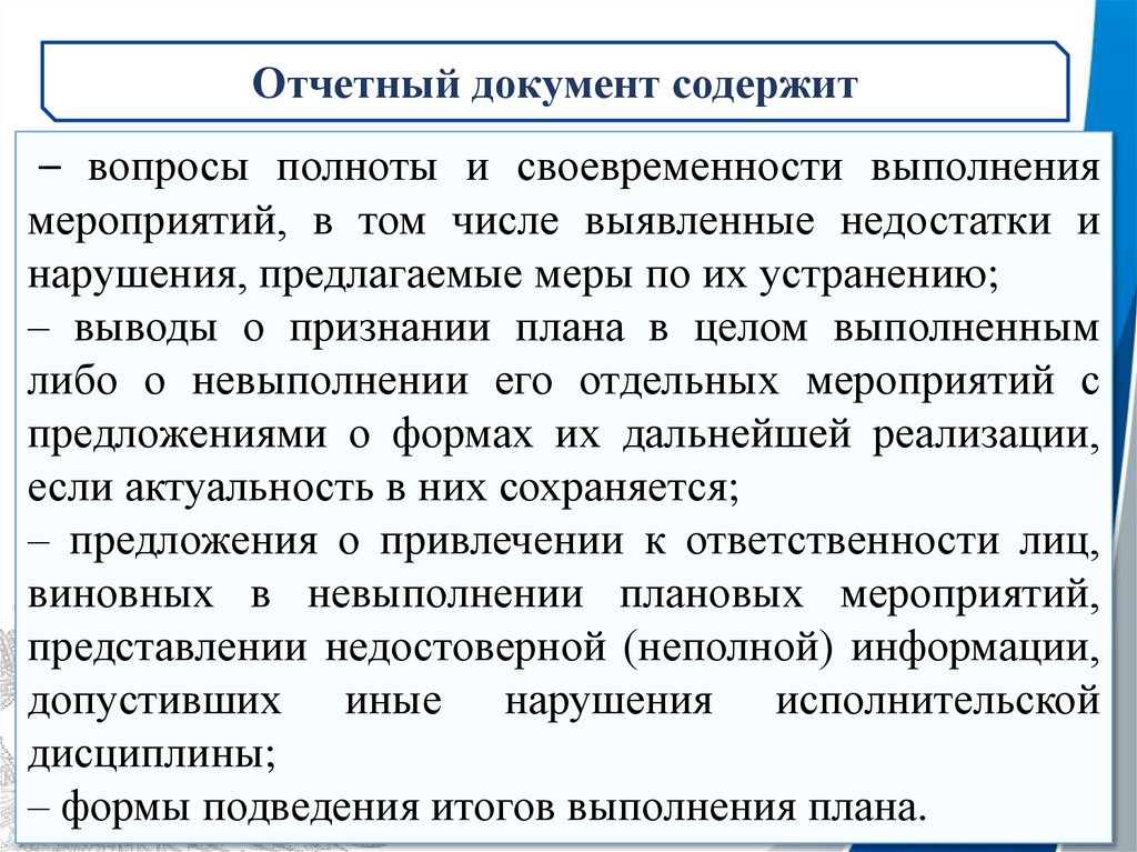 Отчетный документ содержит– вопросы полноты и своевременности выполнения