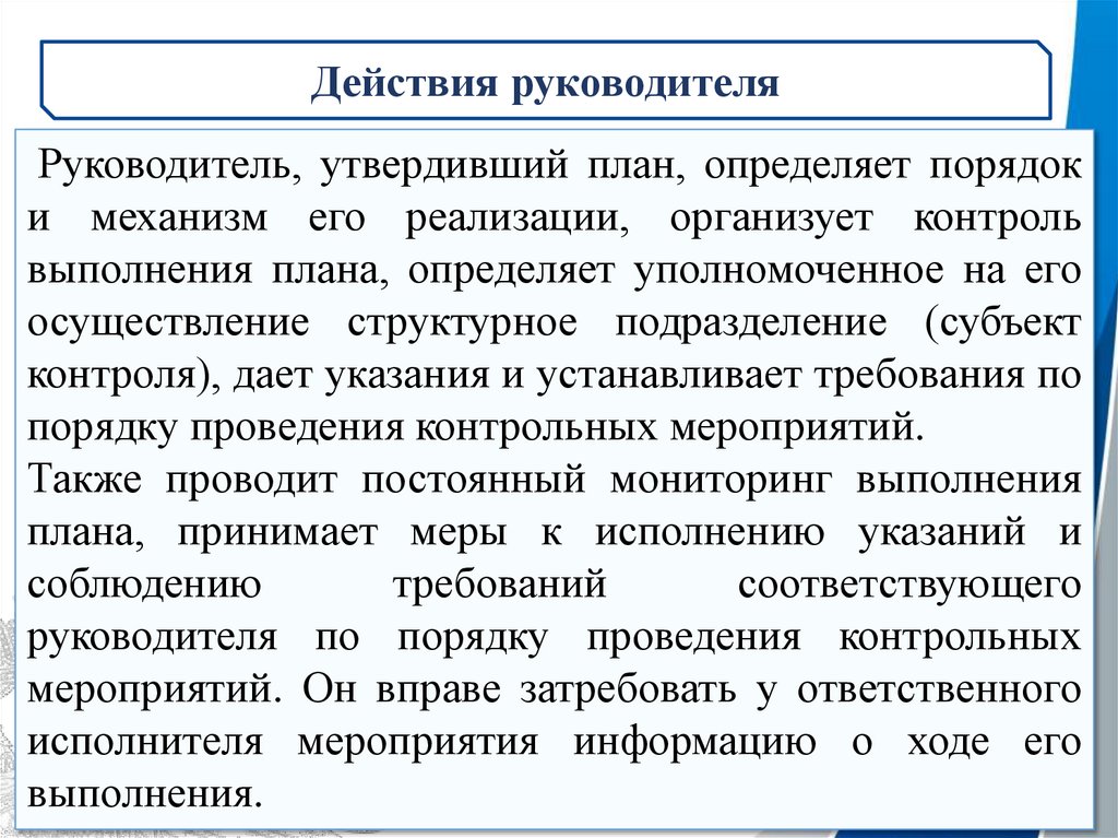 Действия руководителяРуководитель, утвердивший план, определяет порядок
