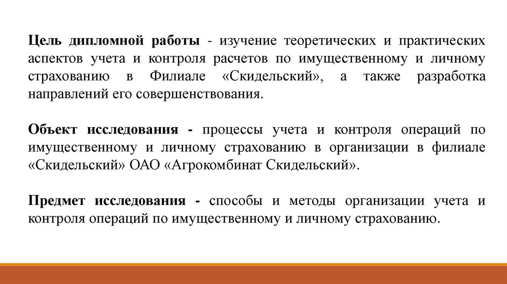 Цель дипломной работы - изучение теоретических и практическихаспектов учета и контроля расчетов по имущественному и личному