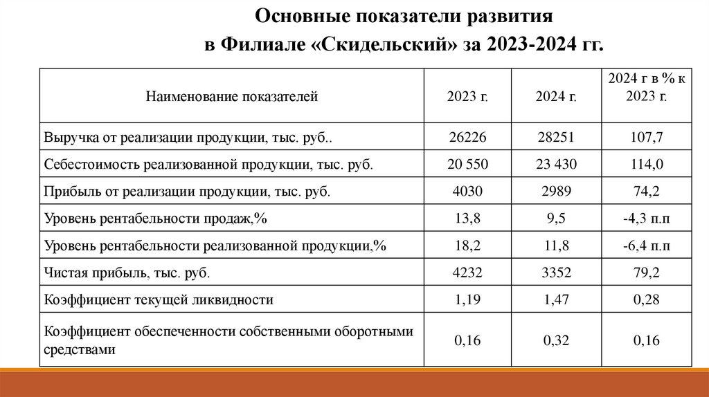 Основные показатели развитияв Филиале «Скидельский» за 2023-2024 гг.