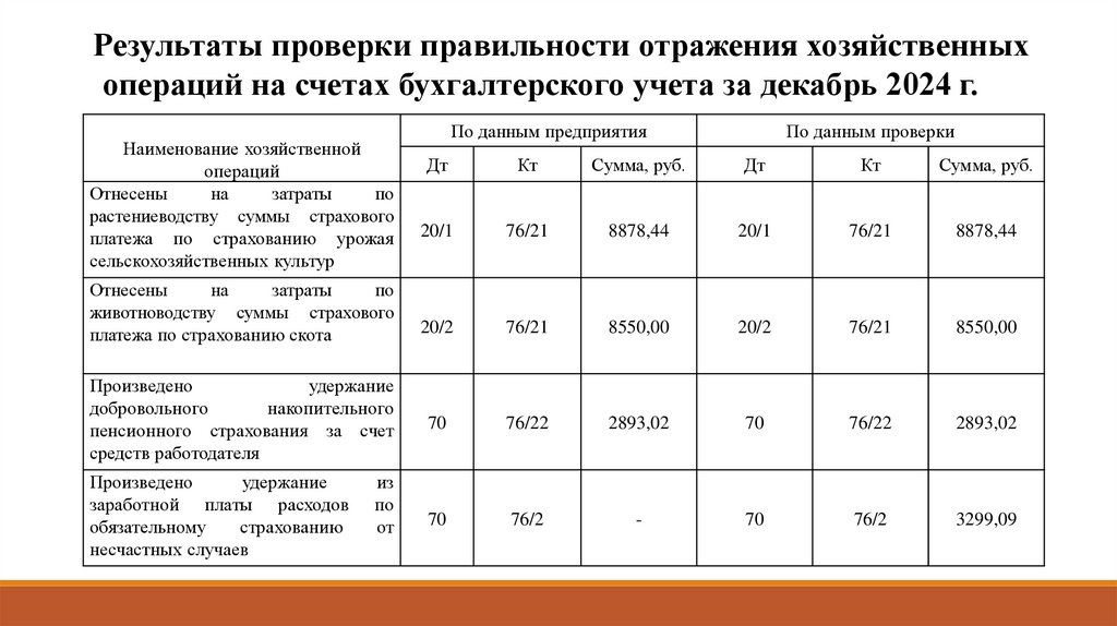 Результаты проверки правильности отражения хозяйственныхопераций на счетах бухгалтерского учета за декабрь 2024 г.