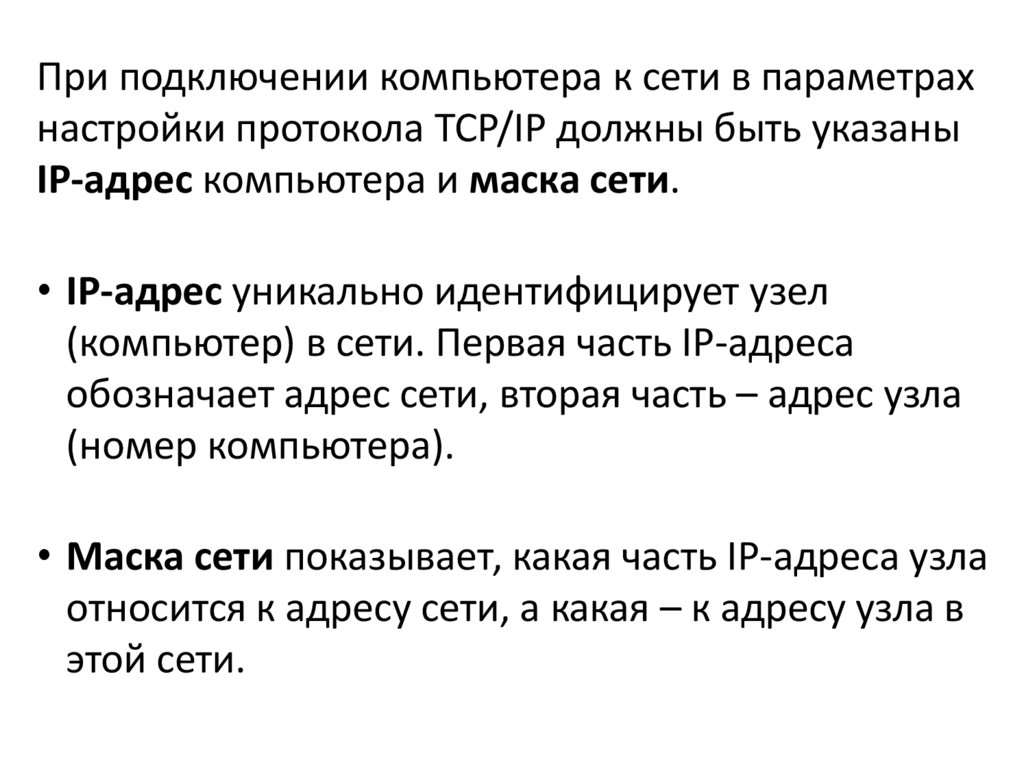 При подключении компьютера к сети в параметрахнастройки протокола TCP/IP должны быть указаны