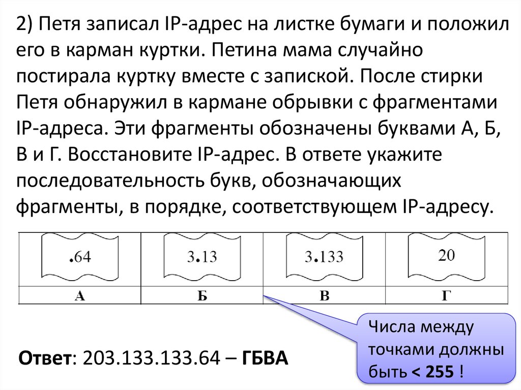 2) Петя записал IP-адрес на листке бумаги и положилего в карман куртки. Петина мама случайно
