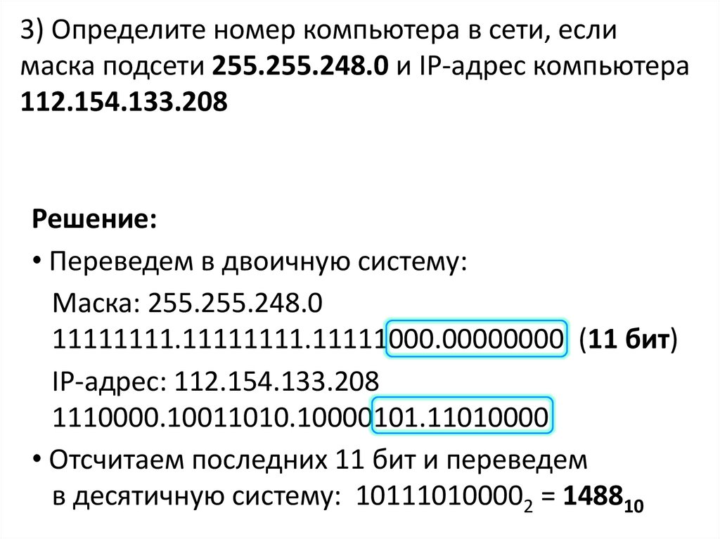 3) Определите номер компьютера в сети, еслимаска подсети 255.255.248.0 и IP-адрес компьютера
