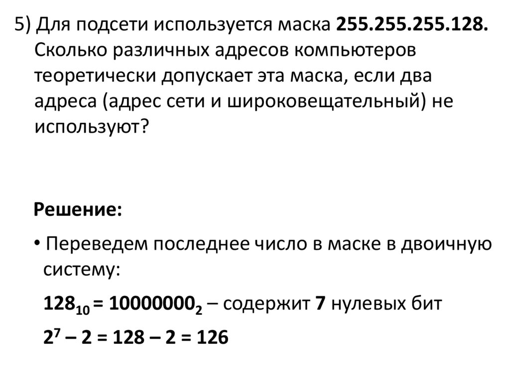 5) Для подсети используется маска 255.255.255.128.Сколько различных адресов компьютеров