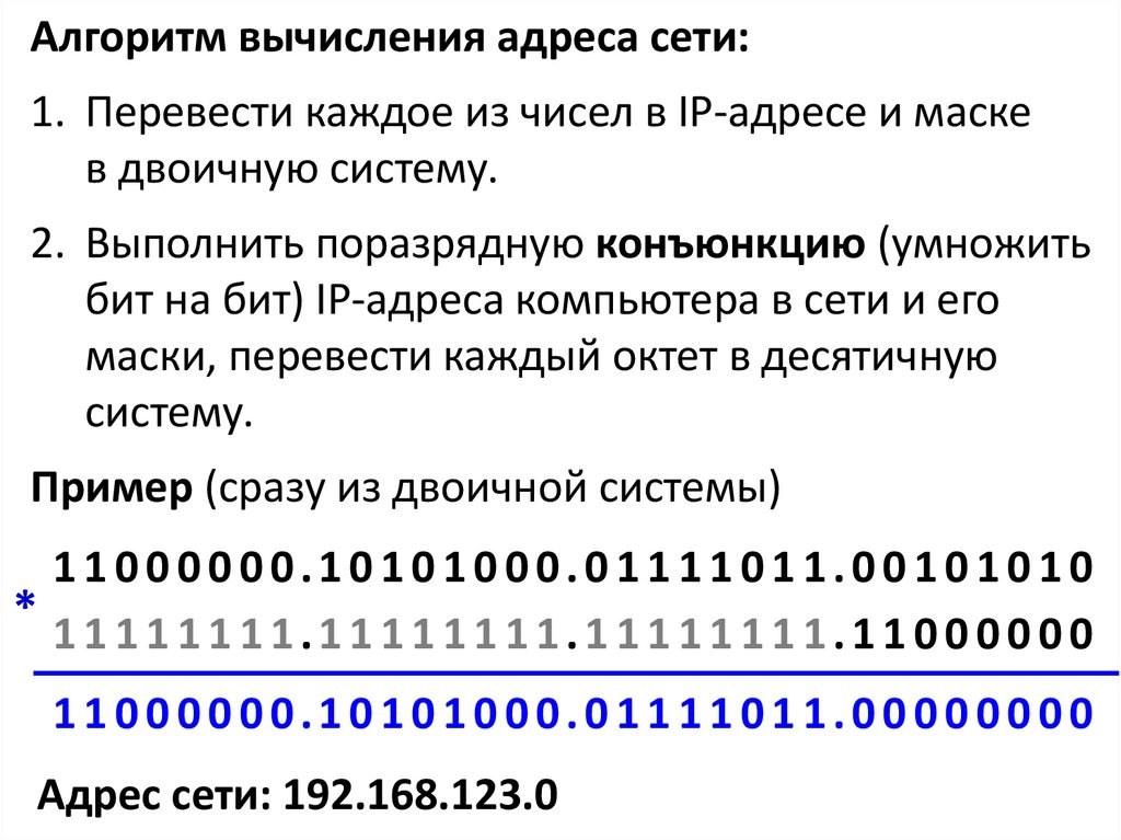 Алгоритм вычисления адреса сети:1. Перевести каждое из чисел в IP-адресе и маске