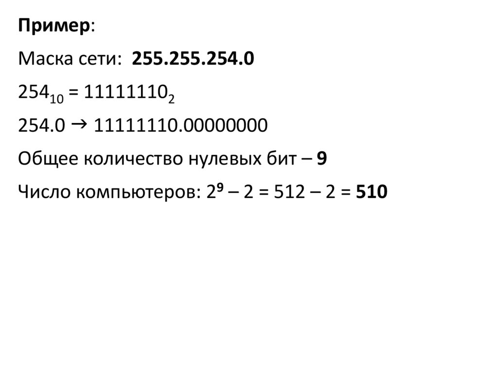 Число компьютеров: 29 – 2 = 512 – 2 = 510