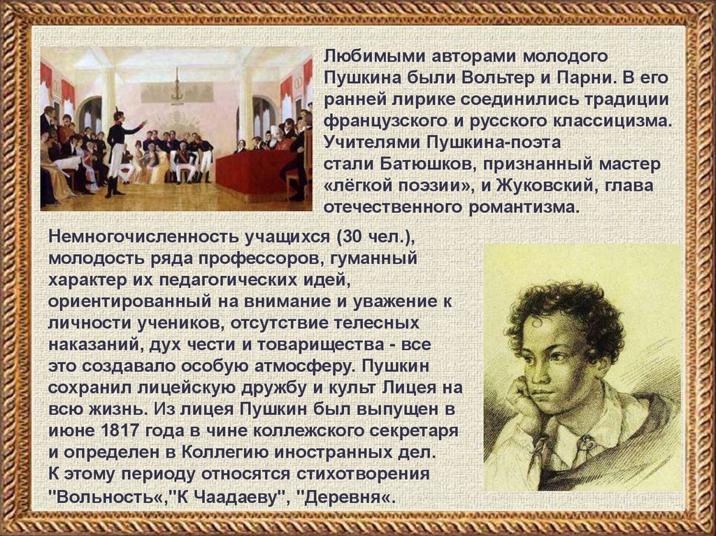 Любимыми авторами молодогоПушкина были Вольтер и Парни. В его
